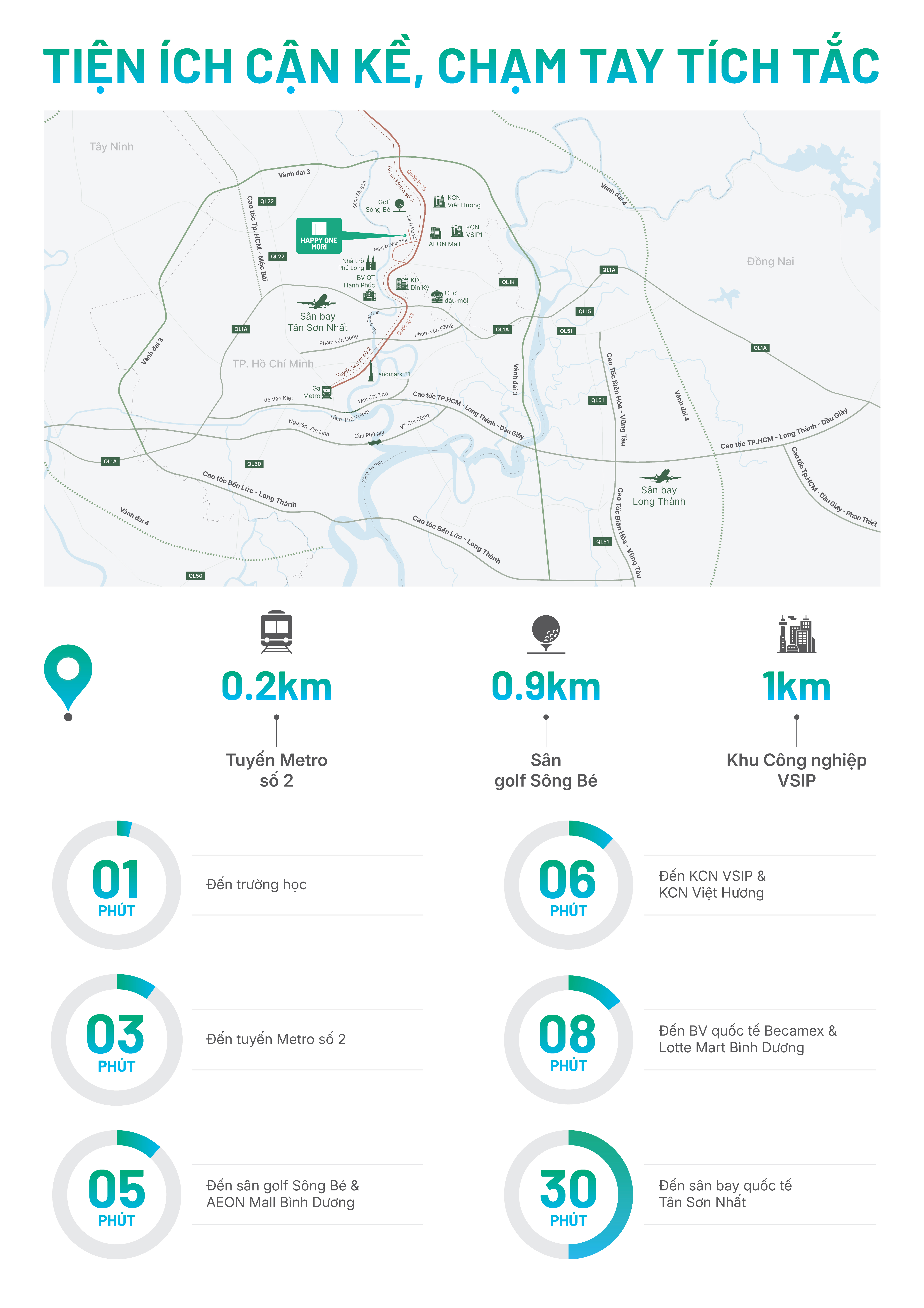Di chuyển từ căn hộ Happy One Mori chỉ mất ít phút để kết nối với quần thể tiện ích phong phú, đa dạng hiện hữu của trung tâm phường Lái Thiêu - TP Thuận An cũ như: